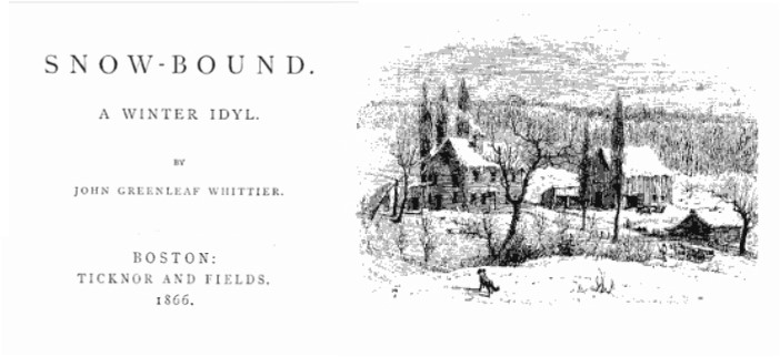 I didn’t know Snowbound at all, so while the snow was falling today, I read this poem written by John Greenleaf Whittier in 1865. In it, a snowstorm brings normal daily activity to a halt, allowing time to ponder the larger realities of life. Whittier eulogizes his family and the rural past. Written in the context of the destruction of the Civil War and the changes being brought about by the industrial revolution it was a popular success. The full poem runs for 747 lines and can be read at the Poetry Foundation-Snowbound.
