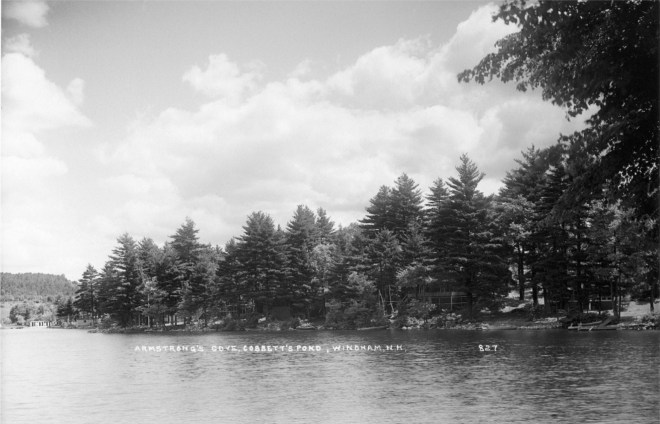 This view shows the shoreline along Cobbett’s Pond which was owned for hundreds of years by the Armstrong family. If you look to the far left you can seen the wooden changing rooms at Armstrong Beach.