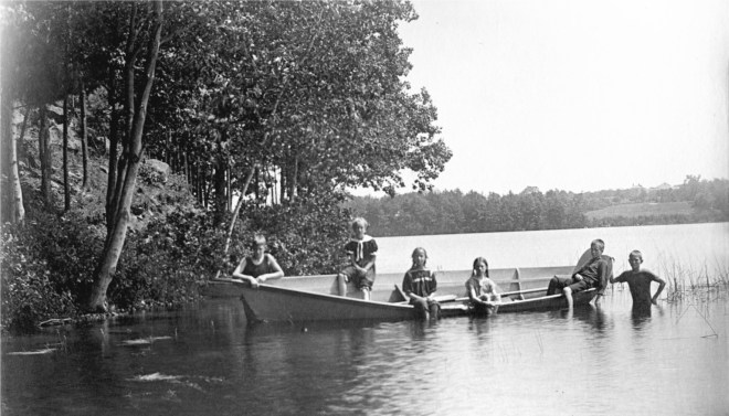 June 16, 1990 (Saturday): Last night Howard and I came back to Fairview. He, like everyone else, thinks it is a pretty place. This morning we launched the canoe for the first time on Cobbett’s Pond. Mary and I went out early and she caught a 20 inch pickerel. Later Howard caught one, and John another, 16 inches. I cut a birch and set up cots in the tent with a little stand between them at the head so they look quite shipshape. The children have been on and in the water all day. It has been perfect, clear, cool, with a fresh breeze.