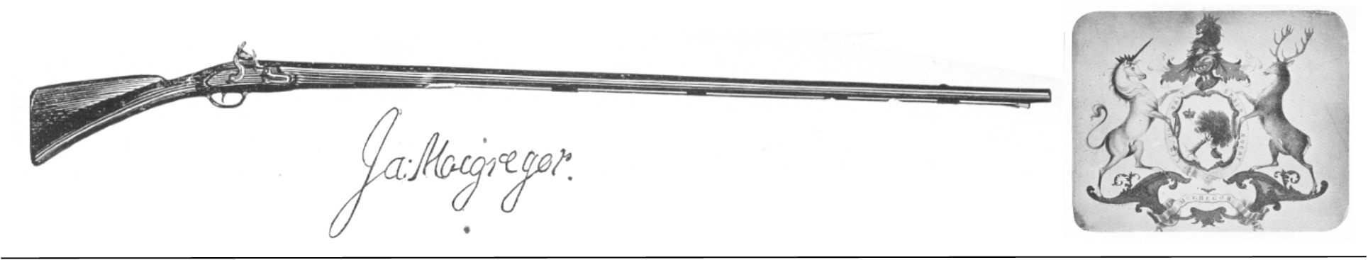 Clockwise: The first framed house in Londonderry built by the Rev. James McGregor. Rev. David MacGregor was the son of the first minister of Londonderry. The McGregor coat of arms. The “auld” gun owned and used by Rev. James McGregor. “ James MacGregor was “the first minister of Londonderry, was born in 1677, and died in 1729. During his brief pastorate of ten years, his influence in town was unbounded in matters temporal as well as spiritual. A gun carried in the famous siege of Derry, (Northern Ireland) in 1688-89, is now in the possession of A.F. Hall, Esq., of Manchester, N.H. Additional interest attaches to it from the fact that Mr. MacGregor always carried it into his pulpit on the Sabbath, well loaded and primed, to be ready in case of sudden attack by the ‘Indian enemy.’ It is well represented by the artist.” Londonderry Celebration June 10, 1869.