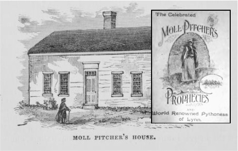 Moll Pitcher was born in 1738 and died in 1813. The legends that grew up around her were real, but were later embellished by Whittier. “Her grandfather, old Captain Dimond, was called the ‘Wizard of Marblehead,’ and it was said : ‘Used to pace the cemetery at night conversing with ghosts and witches and his voice could be heard miles out at sea directing the course of vessels. The History of Lynn states that Mary “Moll” Pitcher was, “connected with some of the best families of Essex County, and with the exception of her extraordinary pretensions, there was nothing disreputable in her life or character. Not only was she consulted by the poor and ignorant, but by the rich and intelligent, by the accomplished and vulgar, the timid and the brave, the simple rustic from New Hampshire and the nobleman of Europe. The predictions concerned love affairs, legacies, discovery of crime, successful lottery tickets, and the more common contingencies of life. These were the subjects of her staple productions; but the most important visitors came from those interested in various ways in the commerce of the region. The sailor before the mast, and cabin-boy, as well as the ship owner, resorted to her humble abode under High Rock, to ascertain the results of a voyage…”