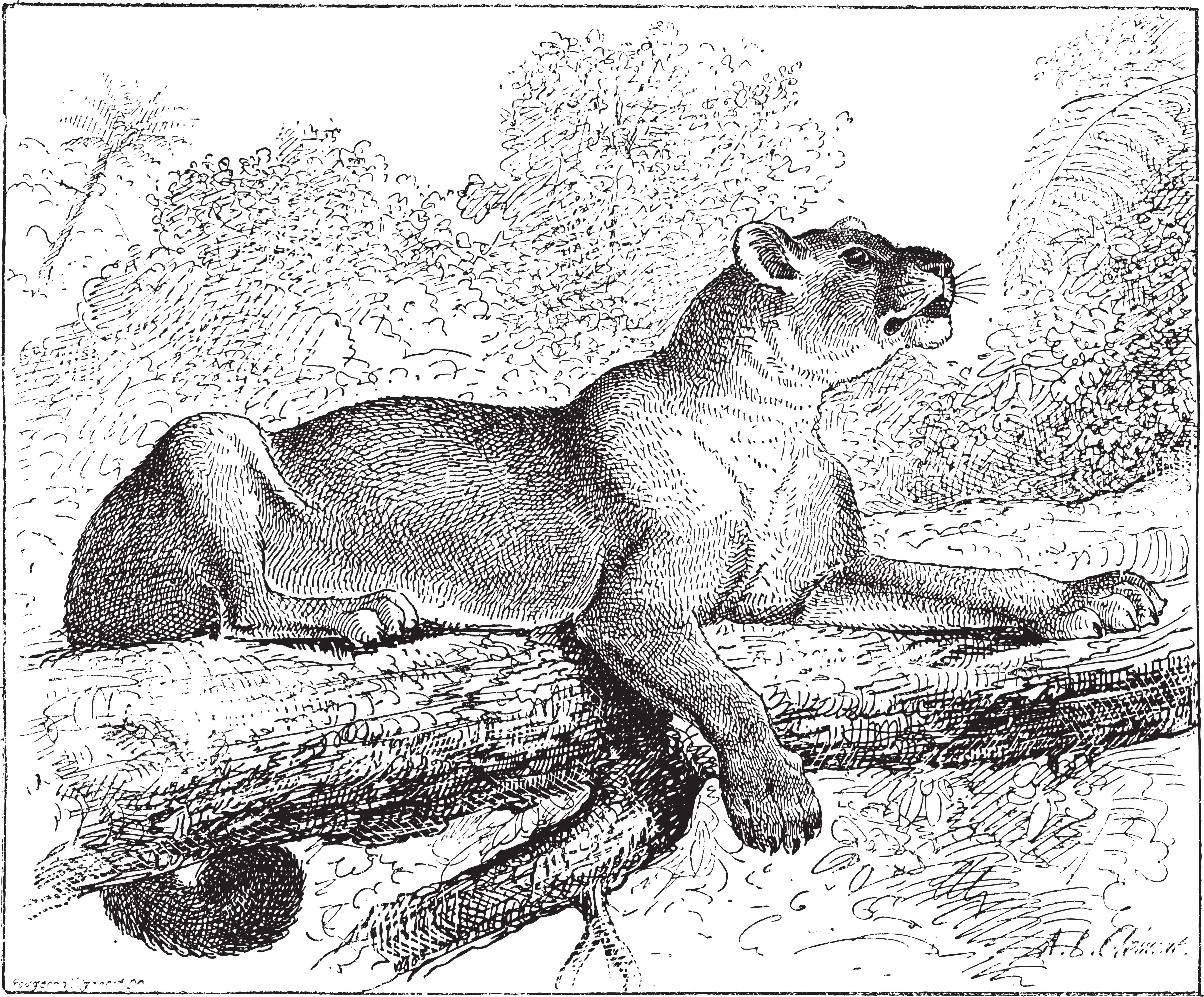 Puma or cougar or mountain lion or catamount or panther or mountain cat, vintage engraved illustration.