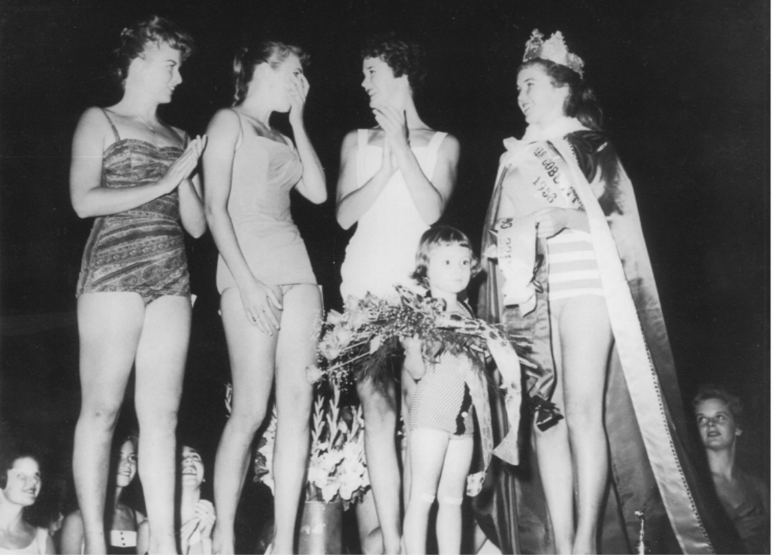Left: Miss Marie Chadwick, Miss Cobbett’s Pond 1958, places the sash on Miss Cobbett’s Pond 1959. Above: The 1959 Miss Cobbett’s Pond Pageant. From left to right are unknown, Carol Drowns, (Miss CP 1959), Polly Ann Sanborn, and Marie Chadwick (Miss CP 1958). The little girl with the flowers is Ronnie Lou Thwaites.