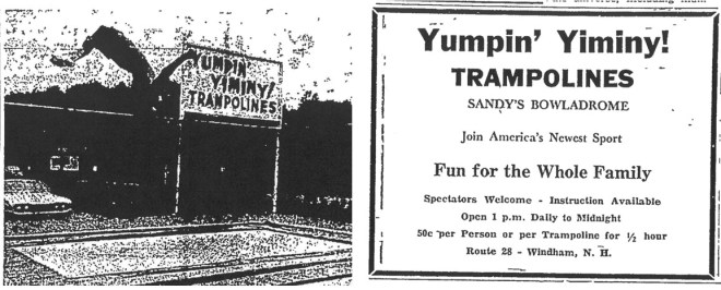 “Caption for the photograph above: “BOTTOMS UP — Derry’s Dickie Laney shown in temporary ‘orbit’ at Sandy’s Bowladrome trampoline area in Windham, has the poise and polish of an old time circus performer. It may come as a surprise to learn that this flight was taken after only a few trips to the popular Windham exercise spot. Experts say he could become one of the best.” Yumpin’ Yiminy! Trampolines were open from 1 p.m. to Midnight, and cost 50 cents for a 1/2 hour.