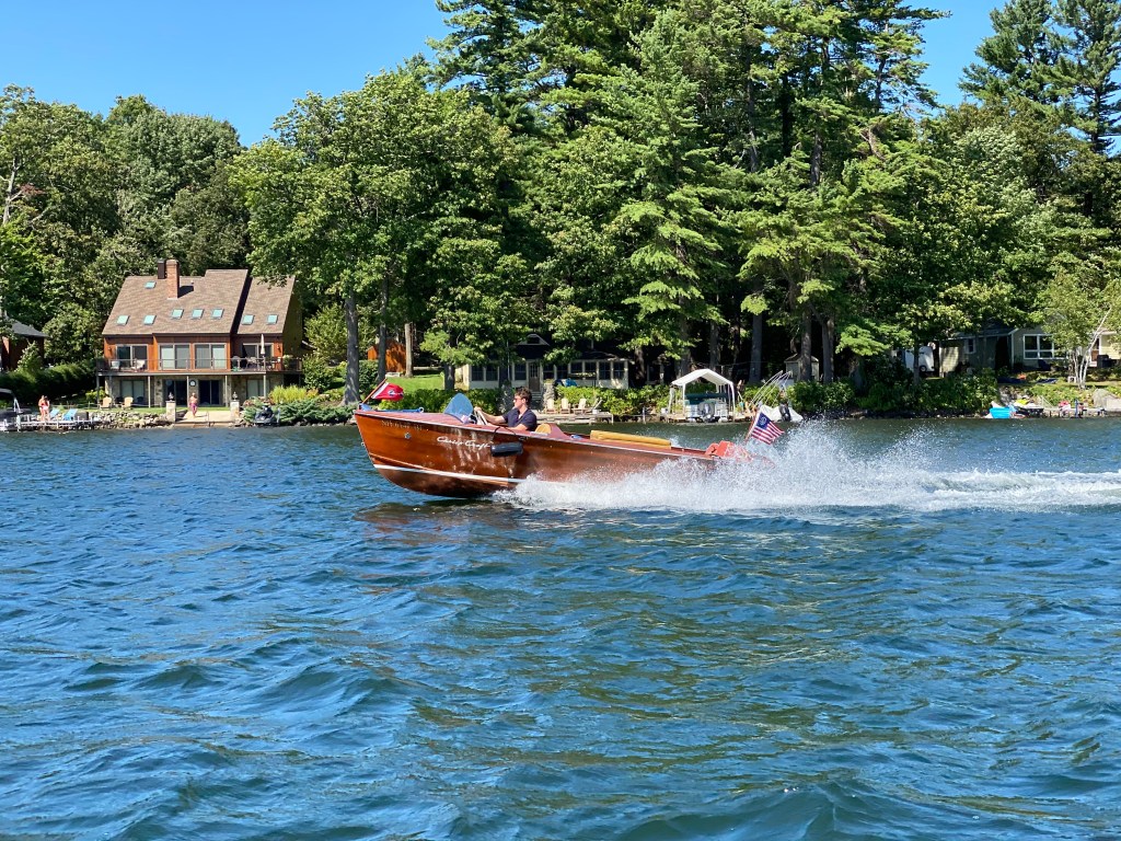 The owner of the boat is Charlie Donahue and he is a twenty year old student who is on his way to a freshman year at Dartmouth. His family has been coming to Cobbett’s Pond for over 50 years. The first family member to enjoy Cobbett’s shores was his mother’s uncle John “Binky” Walsh who rented a cottage next to the former Duncan’s beach in the late 1960’s. “Later he purchased a place on Fish Road—my grandparents Charles and Mary McGongagle then followed suit— and today 42 of our extended family members now summer across six different cottages. I am about to turn 20, and Cobbetts has been a wonderful place to grow up. Earlier this summer I fulfilled a dream of many years and purchased a 1954 mahogany Chris Craft. I have been enjoying it almost every evening on the pond…”