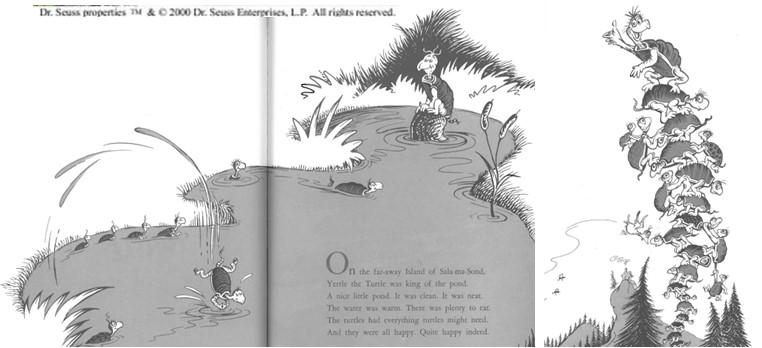 Yertle the Turtle is even darker than The Sneetches, if that is possible. Yertle is the would be dictator, a king of the his turtle pond and he makes all of his fellow turtles climb on each other’s backs until he can see beyond the pond and to the wide world around him which he immediately declares is his. Everything he sees is what he covets and he doesn’t care who he has to climb on top of to get it. This story was actually written by Suess as a metaphor for a Hitler type dictator, but the same theme works for communists and tyrants of all stripes, and even those who have steered America’s disastrous foreign policy for several decades. Its all about concentrated power, and bullying tactics, all overwhelming individual freedom. Doesn’t anybody in the country remember the political philosophy of Thomas Jefferson or Andrew Jackson, or even the beloved Dr. Suess? Is the enlightenment dead; is man not born free? Are we to become cogs or cattle, to be chipped, or phone zombies all controlled from above? That’s odd…I’m actually feeling the weight of little turtle feet on my back as I’m writing this!