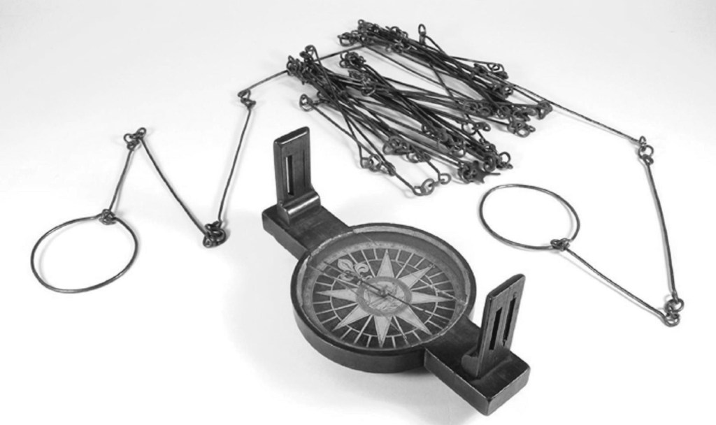 Gunter’s Chain & Surveyor’s Compass. Courtesy of the New Hampshire Historical Society “Gunter’s chain was developed in 1620 and consisted of 100 links, each measuring 7.92 inches, for a total of 66 feet of measurement. The chain included brass rings at every 10 links to facilitate partial measurements. In practice, the chain is stretched out along a defined path and secured to the ground with steel pins. The measurement is then recorded and the process is repeated until the surveyor reaches the final endpoint.”
