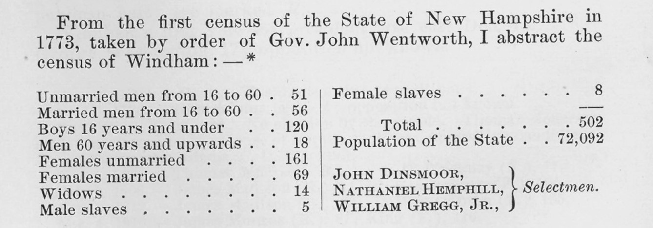 “In 1775 the number of ‘negroes and slaves for life’ in New Hampshire was 657; in 1790, six years after the adoption of the Constitution, 158; by 1800, 8; by 1810, 0; in 1830, 3; and 1840, 1,—mistake of census taker.