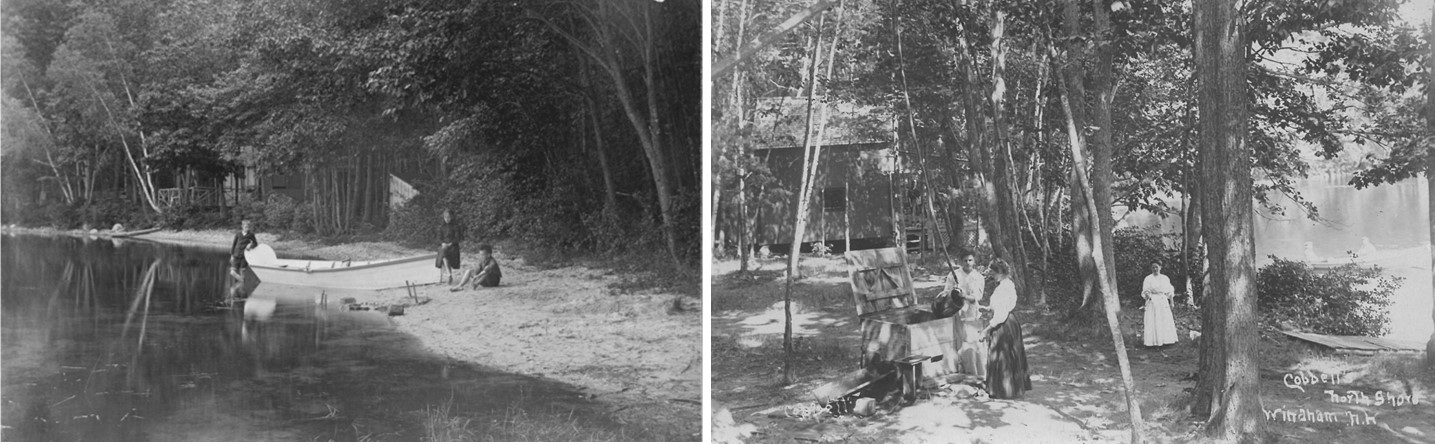 William Harris developed his “resort” on the North Shore of Cobbett’s Pond to be in harmony with it’s natural surroundings. Harris was an avid naturalist who collected the flowers and fauna of Windham. Unlike the tawdry and crowded vacation areas near the beach, he envisioned a place where people could enjoy the solitude and beauty of Cobbett’s Pond. For this reason, the cottages were very privately set among the woods of the shoreline. Glenwood Cottage is one of the last summer “cottages” remaining on the lake today. These photographs are from William Brooks, postcard views and the owners of Glenwood cottage.
