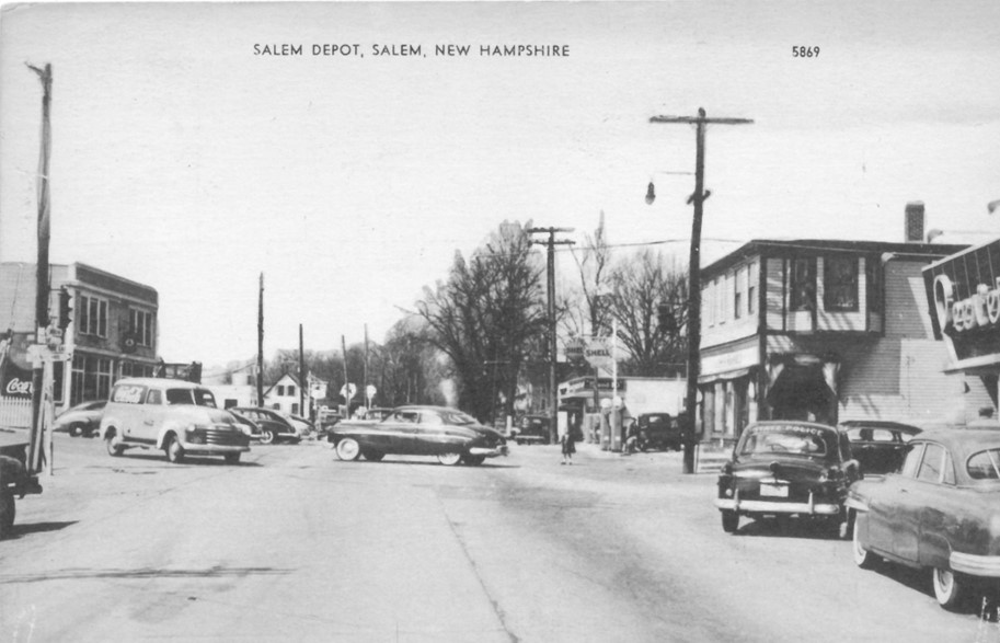 The end of the commuter rail and the trolley service saw the rise of automobile traffic in the Depot. Peever’s Drug store was a local institution that once stood where the Salem Co-Operative Bank is located today. That’s odd, do you see the little girl standing in the middle of the street and “State Police” on right?