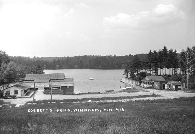 When Route 111 was rebuilt in the 1950’s this stretch of Indian Rock Road became Wyman Road, where the Windham Exxon was located. Today the southbound exit ramps pass just about where the house was located. The road shown veering to the right was County Road, which was a straight shot to Windham Depot. When Interstate 93 was built, it was discontinued except on one end, but it could still be seen, making its way, lined with stone walls, in the median strip of the highway, before the most recent construction. The picture at the upper right shows John H. Dinsmore pushing a wheelbarrow beside Indian Rock Road. County Road and Dinsmore Hill is behind him. The southbound lanes of Interstate 93 are located today, just about where the beautiful stone wall is shown in this photograph. After passing the barn, Indian Rock Road took a steep decent into a gully where a small brook ran into Cobbett’s Pond. On the left, there was a hillside, totally cleared of trees, that offered a panoramic view of Cobbett’s Pond to anyone who took the time to climb it. Today, the residences of “Granite Hill” are located there. On the water, near the brook, John Dinsmore’s son, George Dinsmore Sr., built cottages. At this time, many farmers, who owned frontage on Cobbett’s Pond were doing the same. You might want to know if these photographs make me nostalgic. Since I never knew this time or place in Windham, I do feel that something is lost but it’s not really tangible because I never experienced it. For the people of my grandfather’s generation, however, the construction of Interstate 93 changed everything