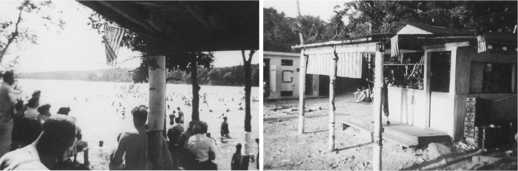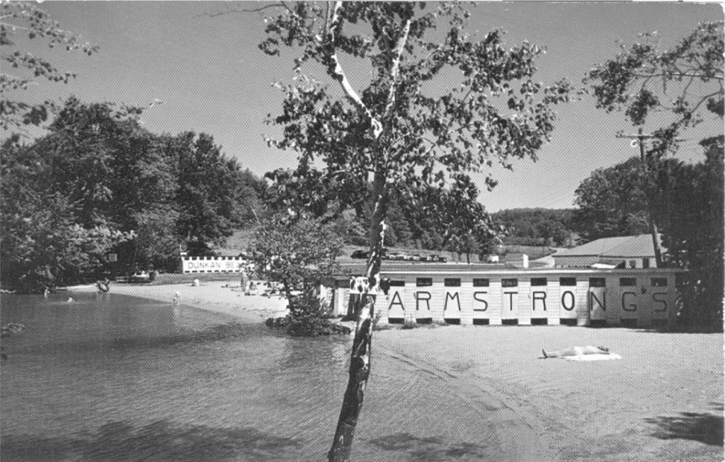 Armstrong Beach was operated by the family many years. My grandparents leased the concession stand one summer. It was one of five, public bathing beaches on the pond. According to Rural Oasis, “At one time this brook was the boundary between Dunkan and Armstrong Beaches and their was a dispute between the properties. “When Bill Ayer, owner of John Dinsmore’s farm on Indian Rock Road, sold his lake property in he 1930’s to George Dunkley of Salem for a public beach the question of correct boundaries arose. Dunkley’s deed read to the brook. Maurice Armstrong owner of the already established Armstrong Beach, claimed the line was several feet to the west of the brook. A bitter dispute, followed by legal actions with many witnesses, proved the brook was the legal boundary. Like the Hatfields and McCoys, George Dunkley and Maurice Armstrong harbored bitter feelings for the rest of their lives.” Apparently, long after, dead fish would go flying across the brook onto the opposite properties in a subtle war of attrition.