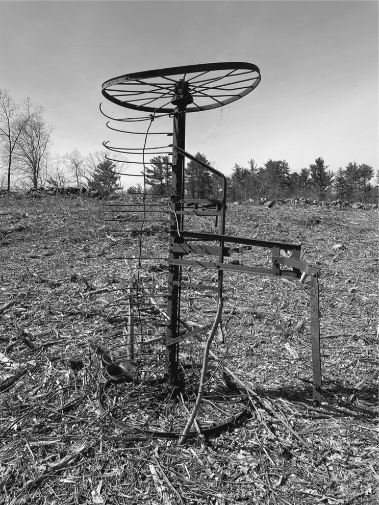 Have any of you wondered about the mystery on the hill, while driving on Rt. 111? This past Monday, with the beautiful warm, Spring weather, I decided to finally walk up the cleared hill near Center School and investigate the strange object there. I had lots of flights of fantasy imagining what it might be, including a rope tow for a ski lift. So I trudged up the hill, ruining my dress shoes, as I always do, and as soon as I reached the object, I knew what it was. You will too if you turn the newspaper sideways. The thing that made it seem strange was it was turned on its side.