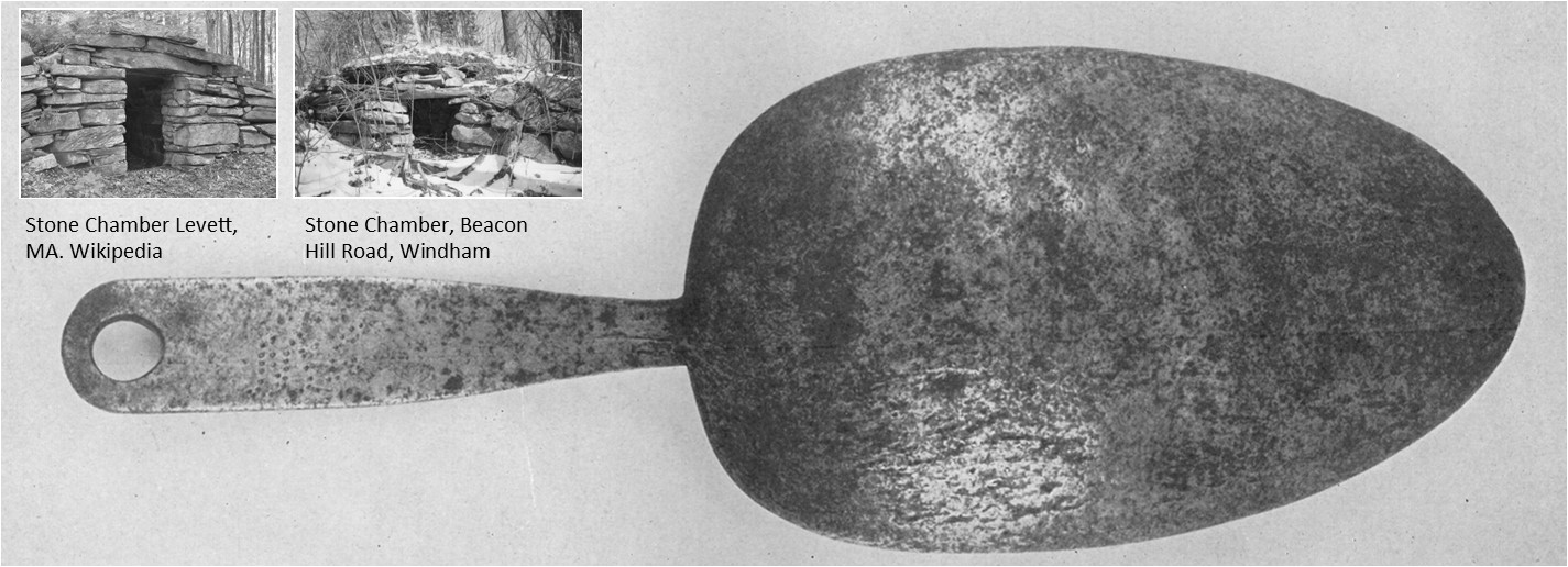 In Windham, there were three additional stone chamber similar to the ones shown above near Canobie Lake; and they were destroyed when interstate 93 was built in the 1960’s. Since this spurtle came from South Windham, it may have come from the area of these three ancient stone chambers. Photographs of Windham chambers were held at Mystery Hill for a number of years but have now disappeared. The Kolbrin or Bronzebook of Britain are salvaged manuscripts known as the Coelbook stored in Glastonbury Abbey… According to legend, ‘The Culdees’ or Celtic followers of Christianity brought these texts to south-west Britain by Joseph of Arimathea in the 1st century AD. Where the spurtle has gone is a mystery.