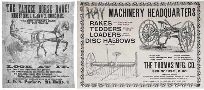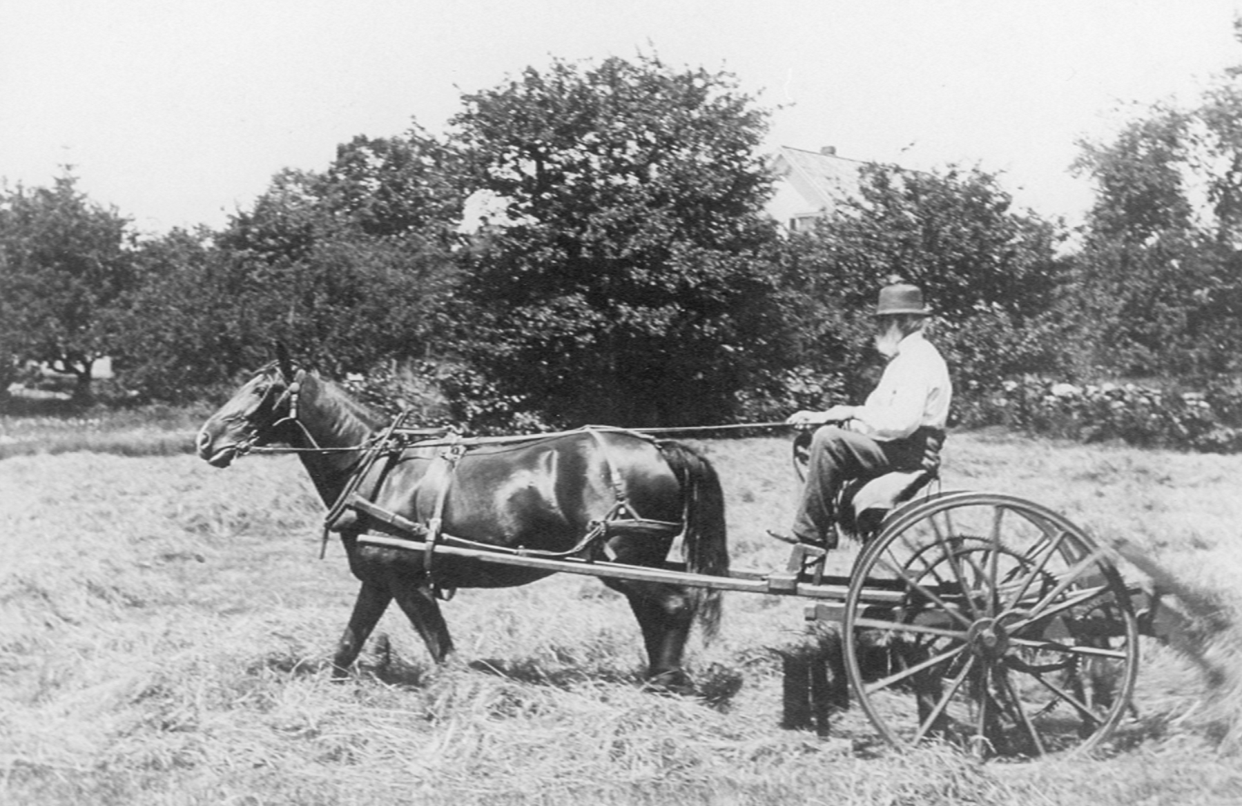 Samuel Campbell is shown above operating his hay rake on his farm, on Kendall Pond Road, Windham in 1895.