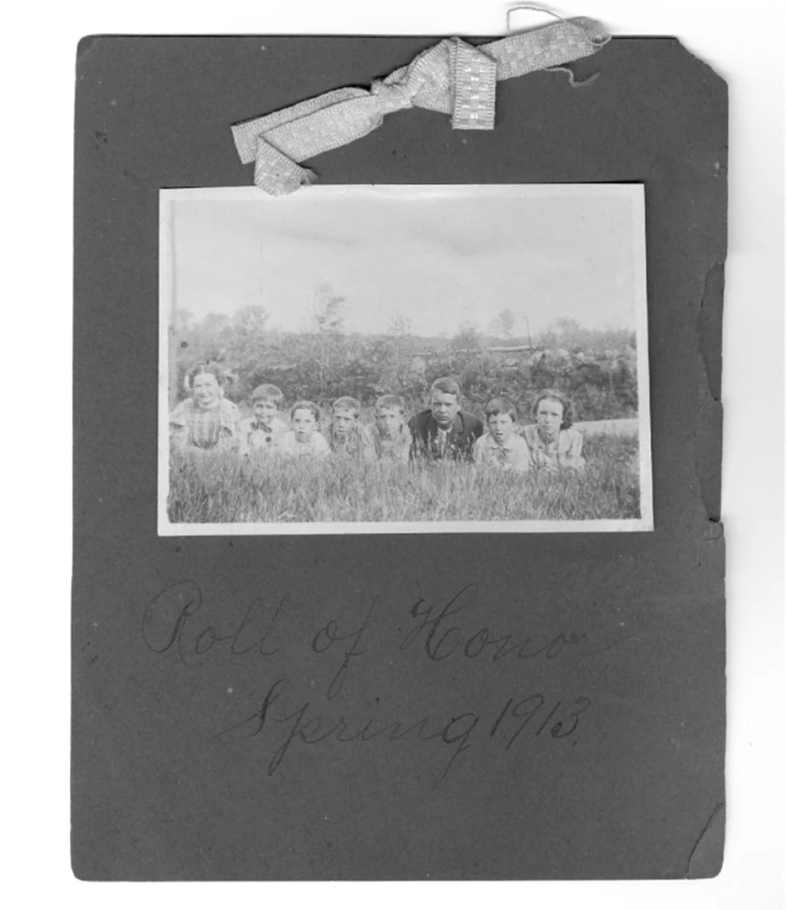 The hand-made award shown to the left was a “Roll of Honor” for the Spring of 1913. The Roll of Honor was for the students at the Number 2 District which was the one room school-house that once stood on a knoll, on Range Road, between Cobbett’s Pond Road and Golden Brook Road. The photograph above was taken right around the same date and the photograph has noted that the Number 2 School was also know as the “Elm Grove” School.