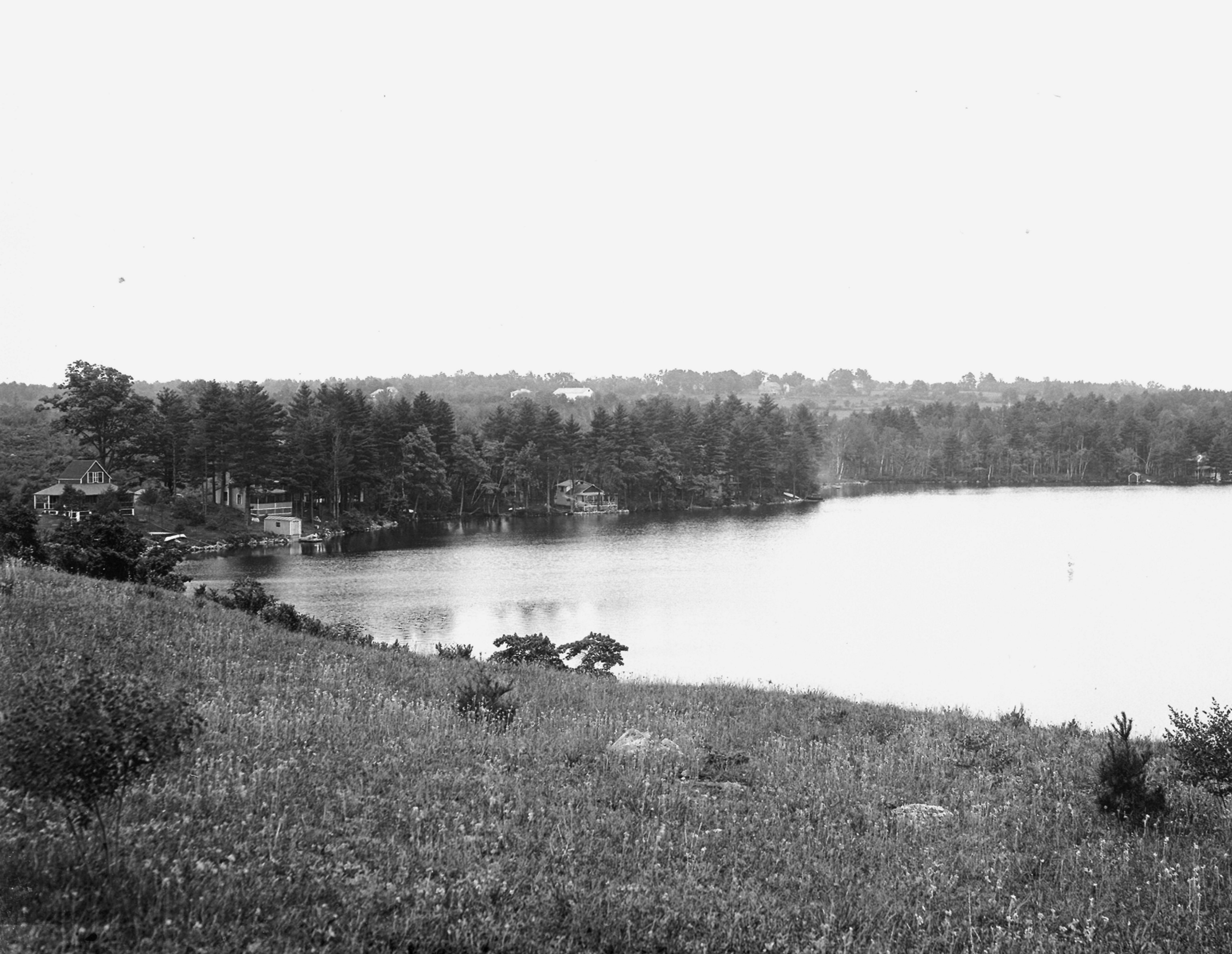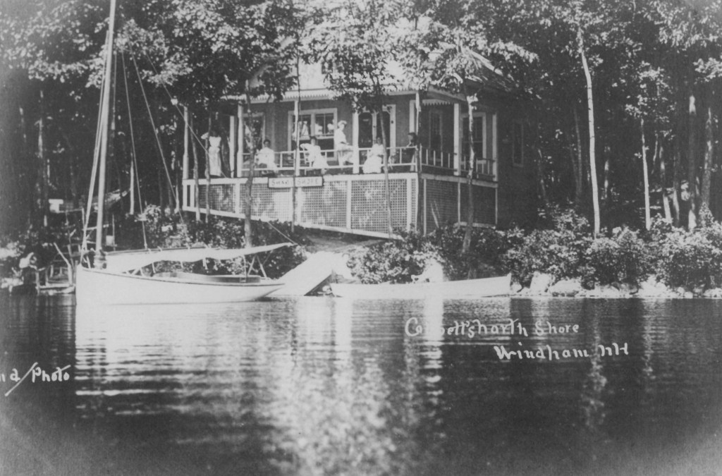 They’re almost all gone…the summer cottages that once lined the shore of Cobbett’s Pond. This is a beautiful view of Armstrong shore with the newly constructed summer cottages overlooking the water. Rural Oasis Says, “A neat little cottage was built by Mrs. Pallester of Lawrence on land leased from George F. Armstrong. There are still a couple of the original cottages left, but most are gone, removed to make room for more commodious year round homes. I remember the red cottage that was once located on the knoll where Richard and Megan Armstrong’s home is located today. The farms of the Windham Range are shown in the background. This photograph and others of the pond are available to purchase on beautiful archival paper from the Penobscot Marine Museum who has the Eastern Illustrating (postcard) plates.
