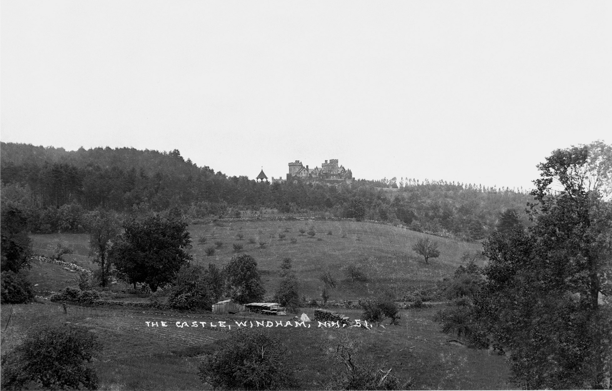 I used to have a nice view of Searles Castle from my spot on Cobbett’s Pond, but not anymore, with the exception of wintertime. The trees have grown up and totally obscure the view of the castle beside one small central tower. This is a Eastern Illustrating photograph near the time of the castle’s construction by Edward Searles. Indian Rock Road, bounded by stone walls, can be seen just behind the shed and piles of wood. I wonder when the wooden observation tower disappeared?