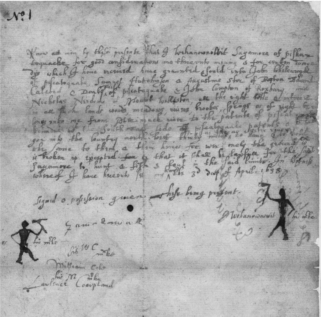 This is the scrap of paper, signed by a local sachem which gives you title to your property in southern New Hampshire. And it is speculated, that the first Wheelwright deed, previous to this one, was a forgery. What you are looking at is the second Wheelwright deed. All the rights you have to the land under your house derives from this document. In other words, it is the first cause of your chain of title.