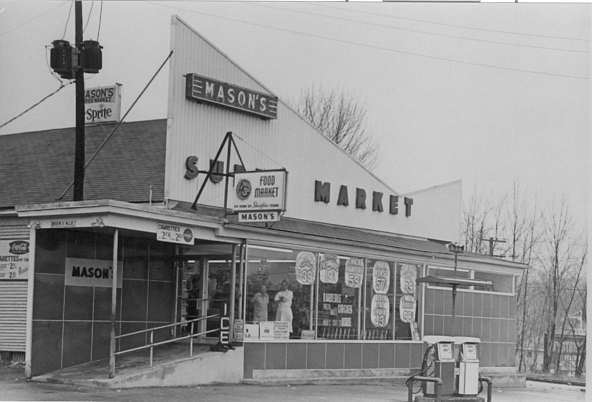 Bob Mason Sr. purchased the property and is seen is the photographs of his store. The many signs advertise groceries, camper’s supplies and Mason’s ice cream. A directional sign in the background advertises Hadley’s beach, Armstrong’s Beach, the Lakeview Golf Course, and the Windham Auto Inn.