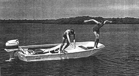 “The pair quickly found that they had tapped into a wellspring of want that propelled this revolutionary rectangle of fiberglass and foam into one of the most successful and beloved boats of all time. And it couldn’t have happened without boys and, as we shall see, girls. Beginning in the late 1940s and early 1950s, the leading edge of the middle class was just breaking out into second homes along the seashore and out at the lake. Dad worked and Mom rode herd on the kids. Naturally enough the kids wanted to be out on the water. The prospect of this scared Mom half to death until Dad came home with this funny looking boat on a trailer. Maybe Dad had seen the Life magazine story showing a proper gentleman in sport jacket, bow tie, and homburg sitting calmly in the stern of a Boston Whaler while a giant buck saw, stabbing up from the deep, cut the boat in two. Perhaps he’d seen this same gent in an advertisement streaking up the rapids of a tidal river at a steep angle. Or maybe that father had read the brilliant advertising headline, “The most compelling reason to put your trust in a Boston Whaler just went to baseball practice….Finally, they knew that two-stroke outboards had just taken a leap forward in terms of dependability, and were impressed that the original 13-foot Whaler could skim along with what seemed like incredible speed when pushed by horsepower in the 9- to 25-hp range. So there you had it: a kid’s need for independent adventure converged with a parent’s need for safety. This convergence, more than anything, explains the success of the first Whalers on the scene, despite what appeared to be, at first glance, little more than a non-nautical hodgepodge of curves and angles. The other thing that brought Dad around to a Whaler is that he knew boats, and guys who knew boats liked the Whaler right off. They liked the lateral stability afforded by the twin keels, and they appreciated the unibond construction, in which liquid foam injected into the cavity between the two fiberglass skins cured and bonded the hull into an unsinkable whole.”
